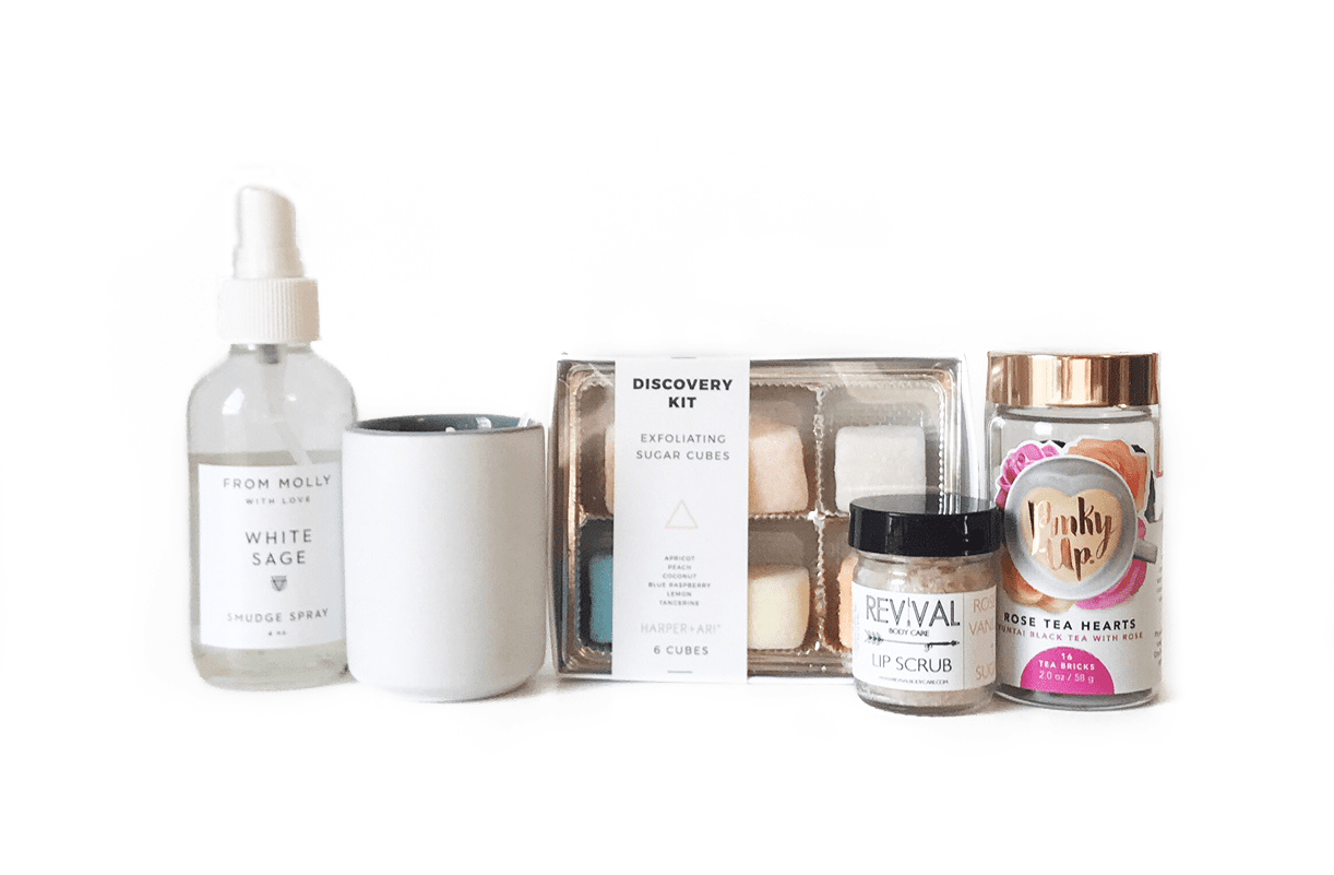 Her Spa Day – Every mom deserves a break and this set will bring the spa to her, with soothing and re-energizing scents and tastes. Includes: White Smudge Spray by From Molly With Love, Rose & Vanilla + Sugar Lip Scrub by Revival Body Care, Exfoliating Sugar Cubes by Harper + Ari, Tobacco Rose Candle by Standard Wax, Rose Tea Hearts by Pinky Up Tea